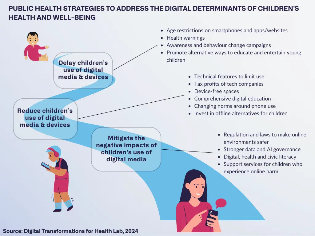 Drawing on lessons from well-established approaches to other public health challenges, the authors summarize three groups of public health interventions that can help delay media use among very young children, reduce digital media use among children of all ages, and mitigate any harmful consequences of children’s digital media use. To build healthy digital environments for children now and for future generations, they recommend a precautionary approach to governance that prioritizes children’s health and well-being, acknowledges their desire to enjoy the benefits of the digital world, and allows children to play a role in shaping their digital futures.