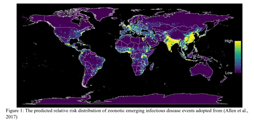 In the changing world of global health, health security threats persist even for the most advanced healthcare systems. Southeast Asia in particular, a region with rapid population growth and dense human-animal coexistence, faces continual risks from outbreaks and public health emergencies related to emerging infectious diseases (EID), natural hazards and unsafe food and water (World Health Organization, 2017). The majority of EIDs originate in animals and the risk of these pathogens spilling over from animals to humans is predicted to be highest in tropical regions including Southeast Asia as illustrated in Figure 1 (Allen et al., 2017). Recognizing the need to prevent these emerging diseases and potential pandemics becomes paramount in the context of the Southeast Asia region’s growth.