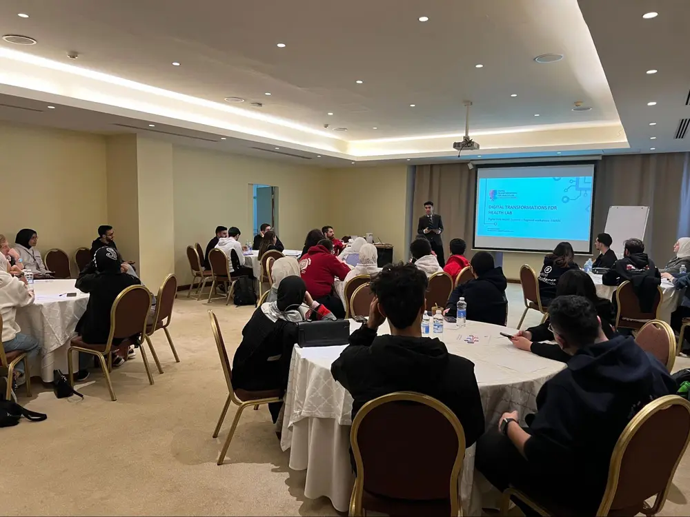 Highlights of Nojus’ participation included delivering a compelling 3-minute presentation on digital health during the opening ceremony. His speech underscored the essential role of youth in shaping digital-first health systems and was delivered to an audience of over 300 medical students, experts, health organization representatives, and the esteemed HRH Princess Dina Mired of Jordan.